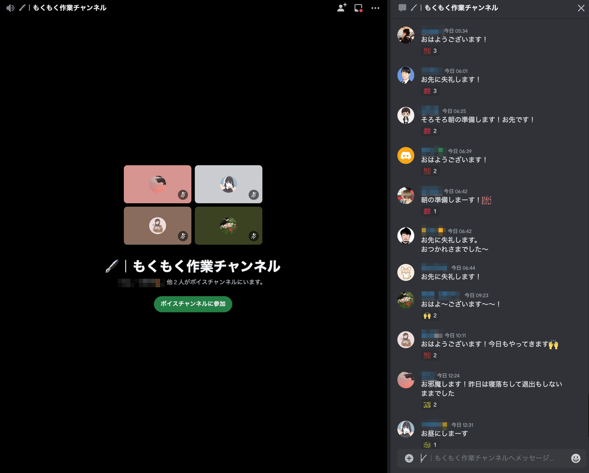 その名の通り、もくもくと作業したいときに使うチャンネル。仲間と一緒に作業に集中できるオンライン自習室。