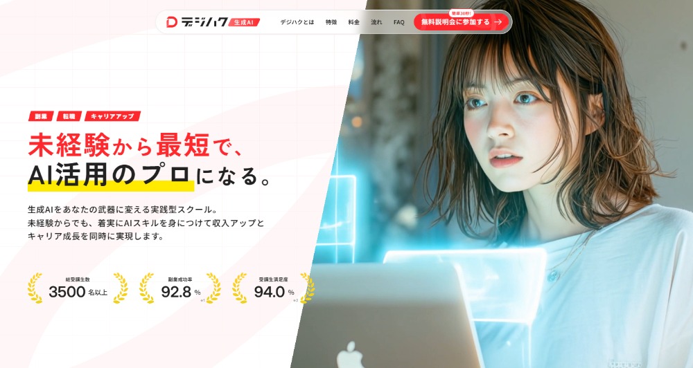 動画編集で実績のあるデジハクが、生成AIの分野に特化した講座を展開しており、即戦力となるスキルを習得できるのが特徴です。
