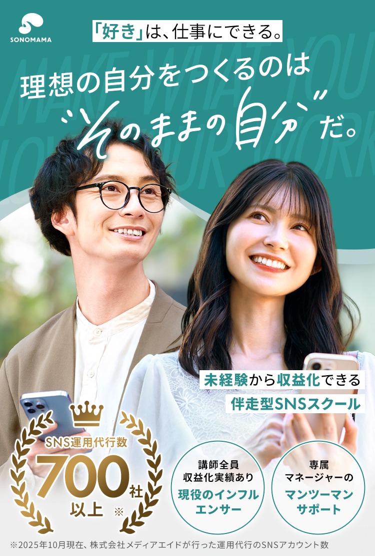 - SONOMAMA:現役インフルエンサーが伴走。SNS発信力を磨きたい人に最適。