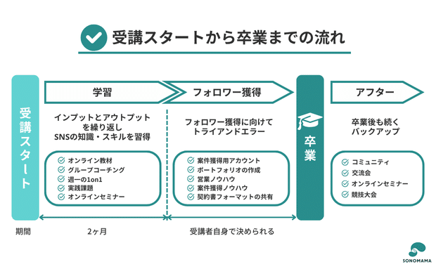 つまり、SONOMAMAは「SNS運用を仕事として行うプロ集団」が監修・運営しているスクール。