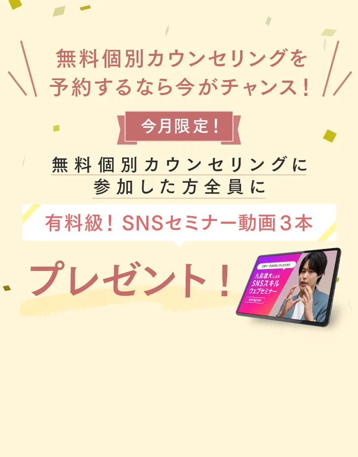 無料個別カウンセリング参加者全員に、“有料級SNSセミナー動画(3本)” を無料プレゼント!