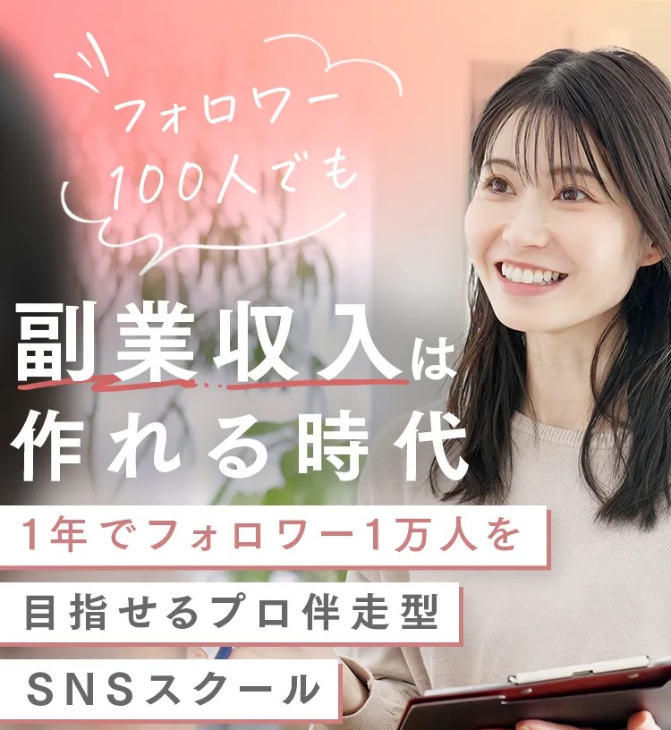 | 対象者 | 初心者〜SNSで仕事を したい人 | 本気でSNS収益化を 目指す人 | SNS×デザインなど 多方面で学びたい女性 | SNSマーケターを 目指す人 | SNS運用代行 副業志向の人 |